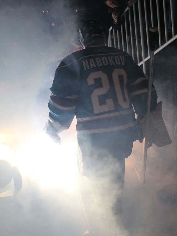 SAN JOSE, CA – APRIL 14: Evgeni Nabokov #20 of the San Jose Sharks enters the ice against the Colorado Avalanche in Game One of the Western Conference Quarterfinals during the 2010 NHL Stanley Cup Playoffs at HP Pavilion on April 14, 2010 in San Jose, California. (Photo by Jed Jacobsohn/Getty Images)