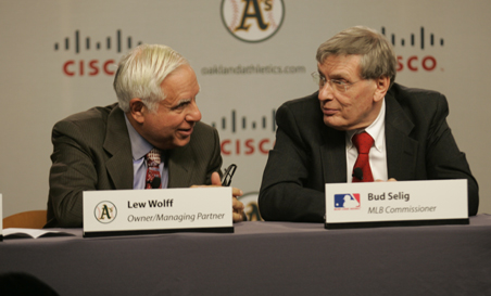 FREMONT, CA – NOVEMBER 14: Lew Wolff owner and managing partner of the Oakland Athletics talks with Major League Baseball Commisioner Bud Selig at a press conference announcing the building of a new ballpark for the Oakland Athletics in Fremont, California, on land owned by Cisco Systems, at their headquarters on November 14, 2006 in San Jose, California. The Oakland A’s will purchase the land from Cisco and have sold the naming rights for the new ballpark to Cisco Systems Inc. (Photo by Michael Zagaris/MLB Photos via Getty Images)