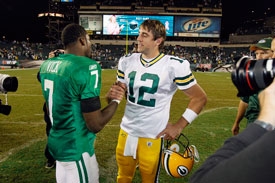 Meehan picks Philadelphia (-2.5). The Packers have one hope to win this game:  That the Philadelphia Eagles show up and expect Michael Vick to do everything.  If Philly shows up balanced, they easily win.  If they do place everything on Vick’s shoulders, they can still win, but it could give Green Bay the opportunity to keep their defense off the field.  The over / under on this one will be difficult to gauge as well, because Vick can put up 28 points like it’s nobody’s business.  It’s possible that the Packers have the potential to get blown the fuck out here.  They aren’t a better team than the Eagles when you factor in all of the injuries.  But, they did have some receivers step up in the Chicago game, so you never know.  Prediction:  Philadelphia Eagles 27, Green Bay Packers 24