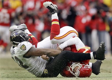 Kansas City Chiefs quarterback Matt Cassel, right, is sacked for a 10-yard loss by Baltimore Ravens linebacker Ray Lewis during the fourth quarter of an NFL AFC wild card football playoff game Sunday, Jan. 9, 2011, in Kansas City, Mo. The Ravens defeated the Chiefs 30-7. (AP Photo/Jeff Roberson)