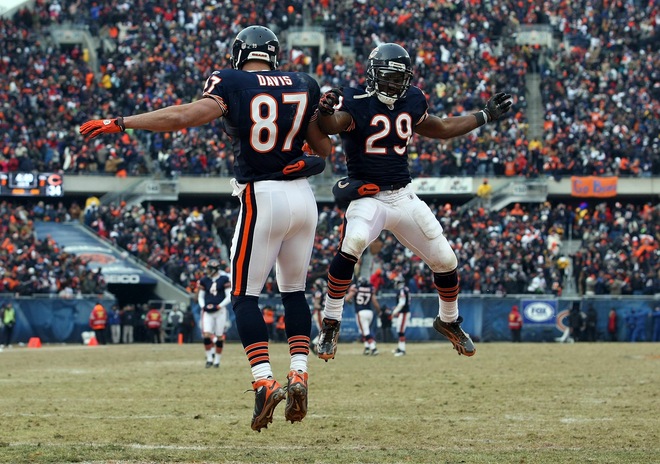 CHICAGO, IL – JANUARY 16: Tight end Kellen Davis #87 of the Chicago Bears celebrates with Chester Taylor #29 after scoring on a 39-yard catch in the fourth quarter against the Seattle Seahawks in the 2011 NFC divisional playoff game at Soldier Field on January 16, 2011 in Chicago, Illinois. (Photo by Doug Pensinger/Getty Images)