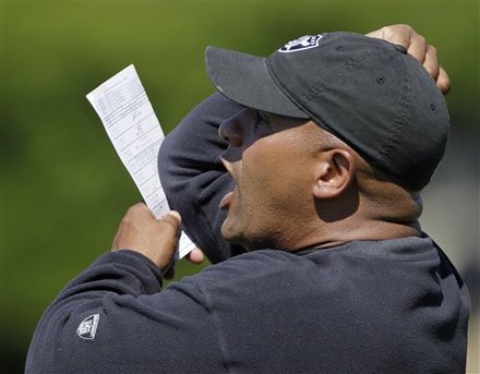 Oakland Raiders coach Hue Jackson yells at quarterbacks to keep their elbows in during NFL football training camp in Napa, Calif., Sunday, July 31, 2011. (AP Photo/Eric Risberg)