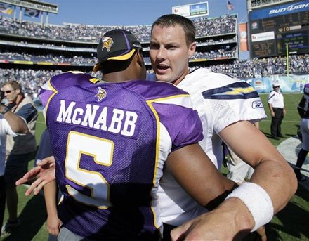 San Diego Chargers quarterback Philip Rivers, right, embraces Minnesota Vikings quarterback Donovan McNabb (5) after the Chargers beat the Vikings 24-17 in their NFL football game Sunday, Sept. 11, 2011, in San Diego. (AP Photo/Gregory Bull)