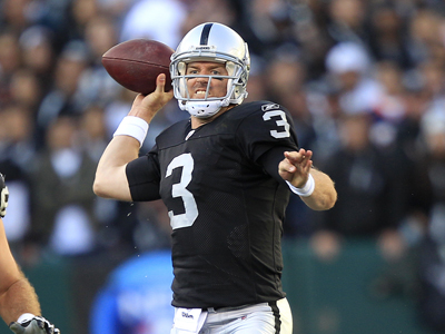 Oakland Raiders quarterback Carson Palmer (3) passes against the Denver Broncos in the third quarter of an NFL football game in Oakland, Calif., Sunday, Nov. 6, 2011. (AP Photo/Marcio Jose Sanchez)