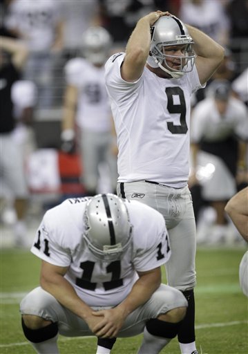 Oakland Raiders’ Sebastian Janikowski, front, and Shane Lechler (9) react after Janikowski missed a field goal as time expired in an NFL football game against the Arizona Cardinals on Sunday, Sept. 26, 2010, in Glendale, Ariz. The Cardinals won 24-23. (AP Photo/Matt York)